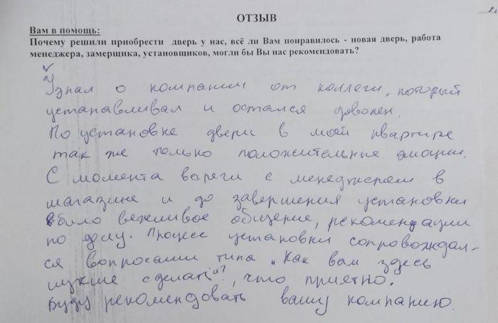 Узнал о компании от коллеги, который устанавливал и остался доволен. По установке двери в моей квартире также только положительные эмоции. С момента встречи с менеджером в магазине и до завершения установки было вежливое общение, рекомендации по делу. Процесс установки сопровождался вопросами типа "Как вам здесь лучше сделать?", что приятно. Буду рекомендовать вашу компанию.